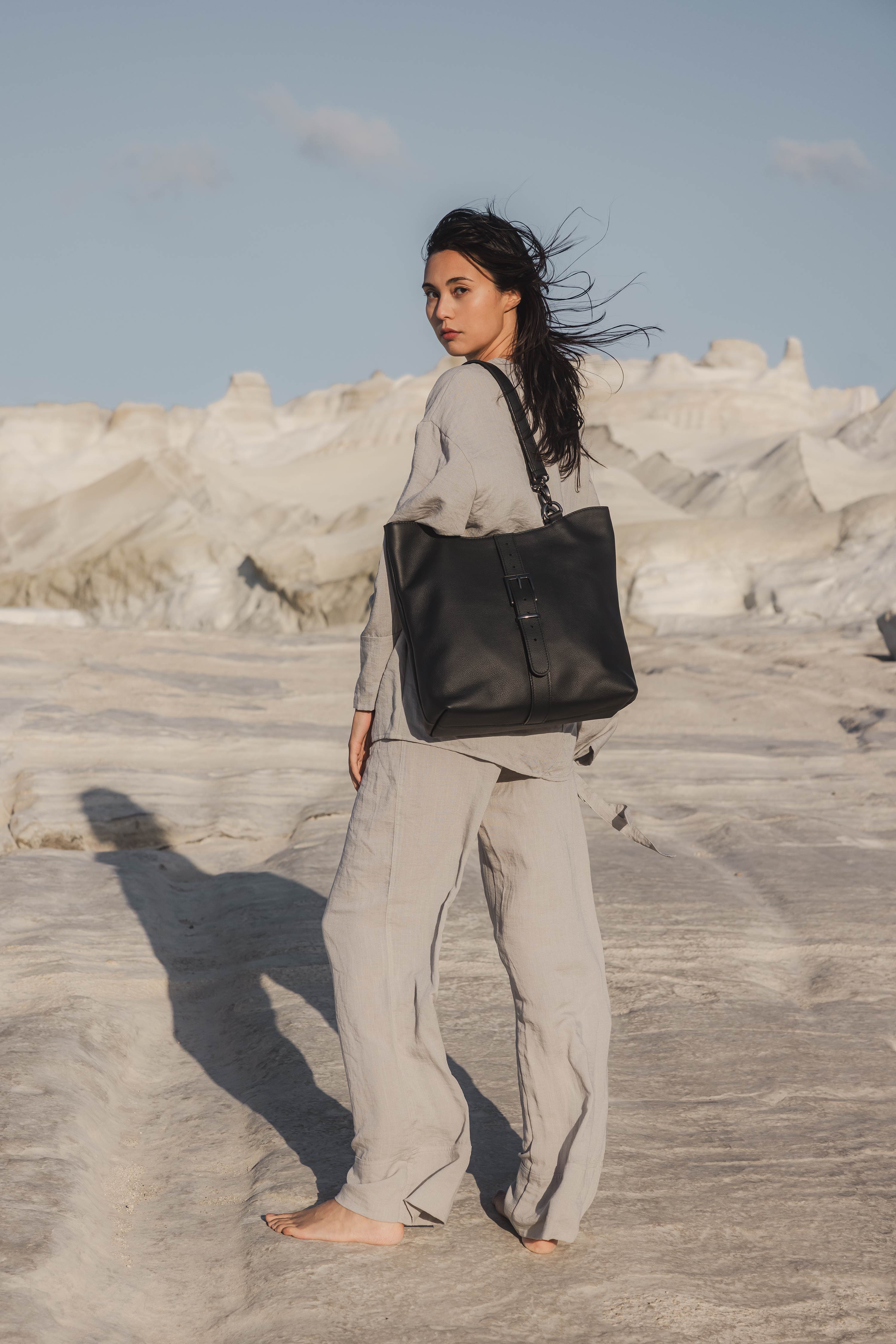 Sa forme cabas embrasse les essentiels d’une journée bien remplie : un carnet, un ordinateur, une écharpe oubliée, un peu de soi.