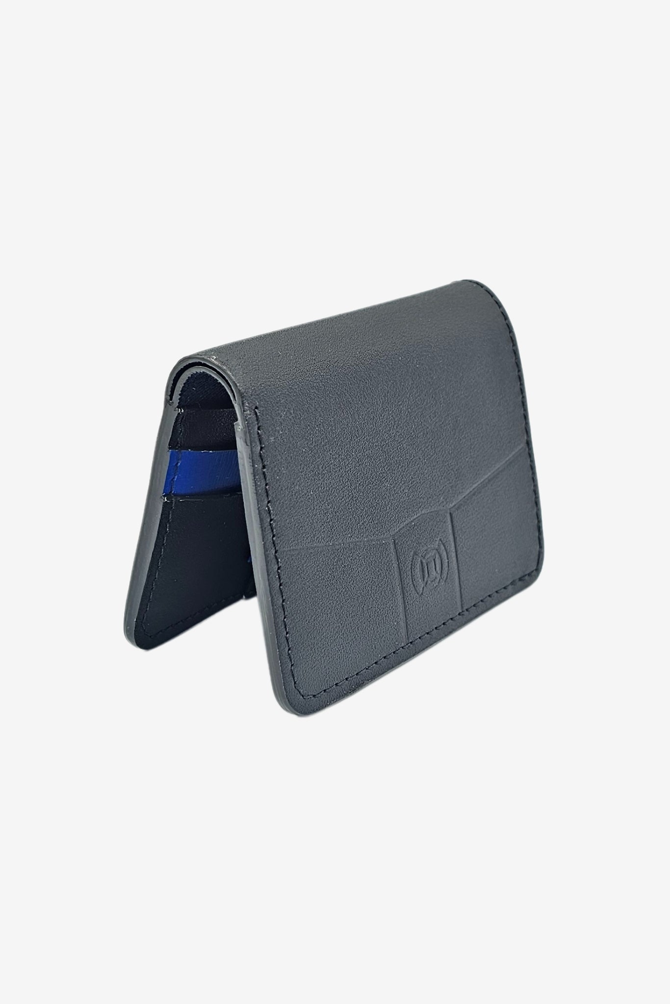 Découvrez le portefeuille en cuir noir Arsène avec sa couleur contrastée bleue à l'intérieur. Un petite portefeuille en cuir fabriqué en France dans notre atelier à Romans sur isère.