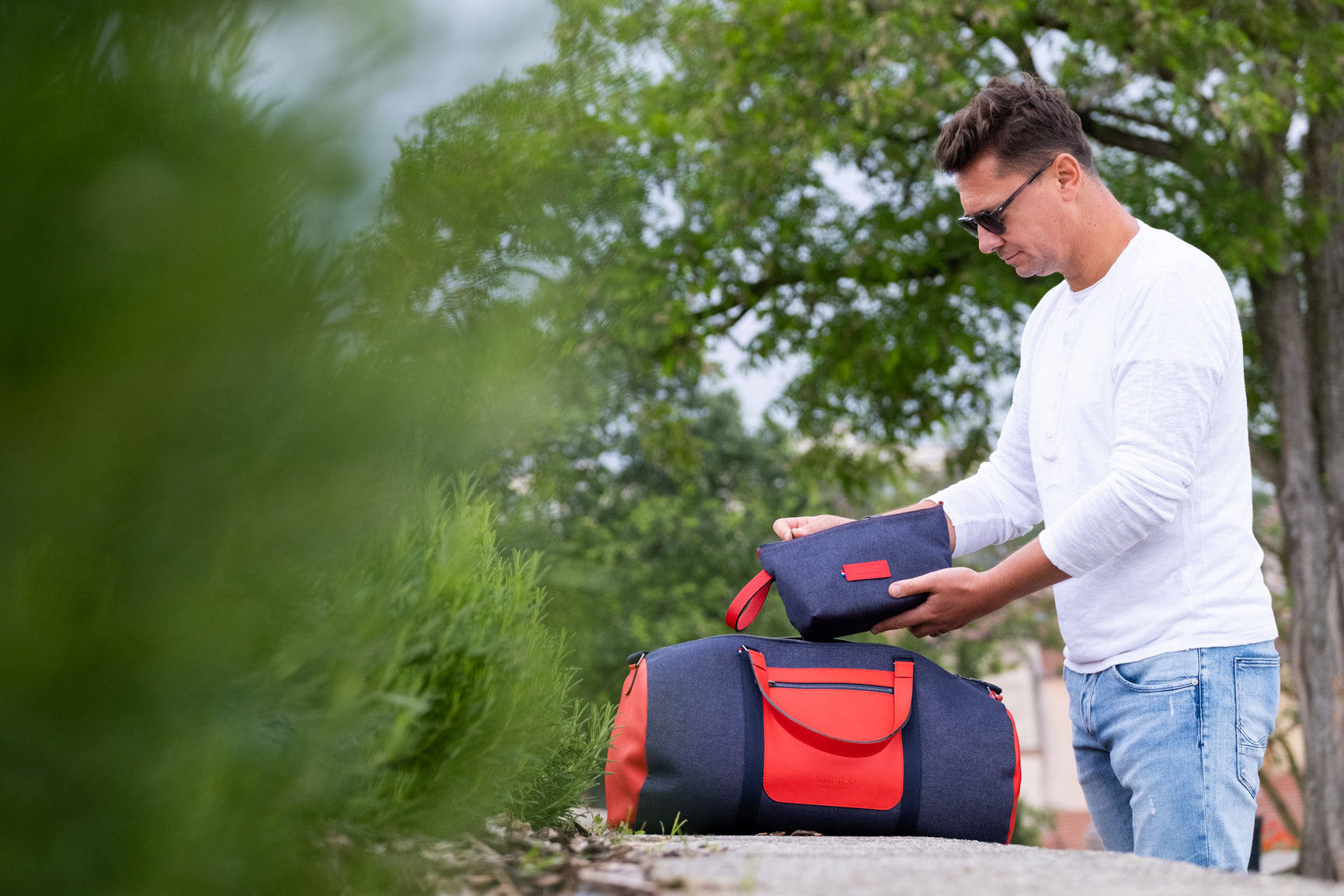 Jacques est un sac polochon rouge. Entièrement créé à base de cuirs de luxe destinés à la destruction et de jean français. C'est un basique : pratique & élégant, 100% fabriqué en France.